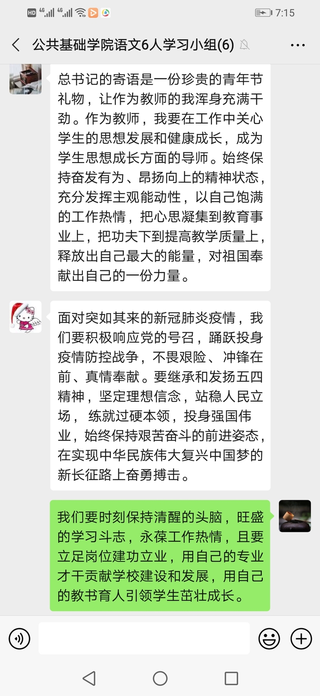 语文教研部在部长陈卫炉老师带领下,大家边学边思考,把思政政治学习和育人工作、教学、科研等紧密结合。教研部教师6人集体向组织提交了学习报告。青年党员教师常铖表示:“我们要积极响应党的号召,踊跃投身疫情防控战争,不畏艰险、 冲锋在前、真情奉献。要继承和发扬五四精神,坚定理想信念,站稳人民立场, 练就过硬本领,投身强国伟业”。民主党派教师神慧提出:“作为一名教师,不仅要在工作中为人师表,在防疫工作中也应提高认识,不仅要完成自己教书育人的职责,更要向防疫斗争中的英雄们学习,与国家同呼吸、共命运。”常浠婧老师倡导:“以理想信念教育为核心,以品德教育和政治教育为重点,根据学生的心理特征和时代特点,改革教育教学方式,加强教学中的德育渗透。日常要关心学生的思想发展和健康成长,成为学生思想成长方面的导师。”赵瑾、刘丹等教师也都纷纷表示,将时刻保持清醒的头脑,旺盛的学习斗志,永葆工作热情,且要立足岗位建功立业,用自己的专业才干贡献学校建设和发展,用自己的教书育人引领学生茁壮成长。