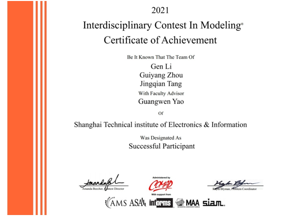4月23日夜间,2021年美国大学生数学建模竞赛成绩公布。由通信与信息工程学院的李根、唐菁倩以及中德工程学院的周贵阳组成的我校代表队不畏强手,克服种种困难,最终成功获得本次比赛的三等奖。