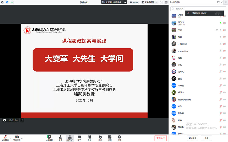 2023年5月29日,上海市课程思政与文化素养教指委专家滕跃民教授应邀为公共基础学院全体教师作课程思政线上培训。培训会由公共基础学院姚光文院长主持。