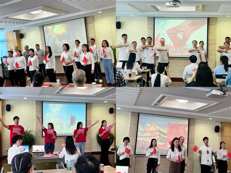 活动以百年党史为脉络,分为“峥嵘岁月”“日月新天”“领航时代”三个篇章。活动在《义勇军进行曲》中拉开帷幕,全体党员教师充满力量唱出团结的力量和民族自豪感。接着,第一党小组的数学老师通过合唱《没有共产党就没有新中国》唱响了抗日战争时期亿万人民驱逐侵略者、建立新中国的壮志豪情。第一、第二党小组的体育、物理老师唱起热血沸腾、豪情满怀的歌曲《我们走在大路上》,受到了老师们的热烈欢迎和由衷喜爱。第一党小组的语文老师深情朗诵《盛世中国》,展现了新时代下教师凝心聚力、满怀信心走进新时代的风采。最后,学院办公室老师通过《不忘初心筑梦前行》的诗词和音乐传递能量,展现了学院教师不断向着新的目标破浪前进的勇气和决心。